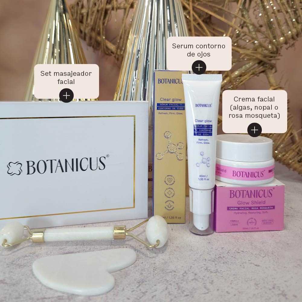 Contenido: Set masajeador facial + Crema facial (rosa mosqueta, algas, nopal) + Sérum contorno de ojos. + Tote Bag Verde (solo aplica en tienda en línea).