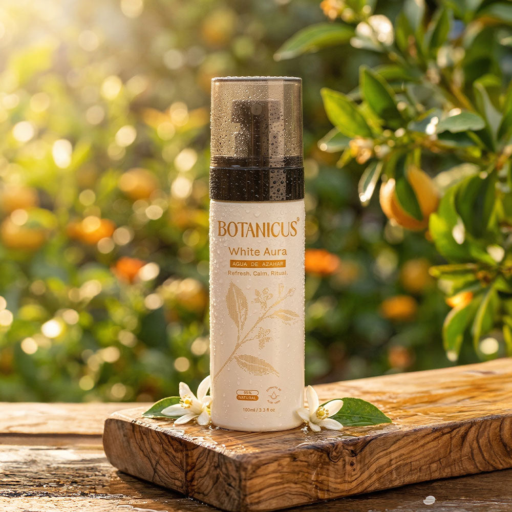 - Prepara y equilibra — White Aura Agua de azahar con ácido hialurónico y aloe que hidrata, calma y crea la base perfecta para que el sérum penetre mejor.